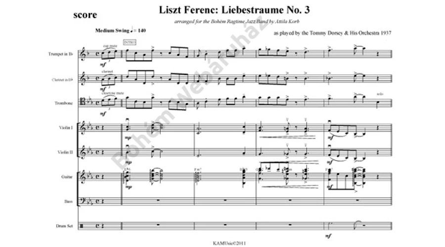 Liszt Ferenc egyik legnépszerűbb zongoradarabja swing stílusban, a Tommy Dorsey Orchestra 1937-es felvétele alapján. PDF-ben letölthető a partitúra és az összes szólam is. Hangszerelés: Korb Attila |